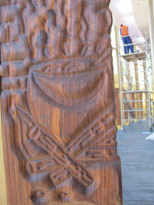 The totems were carved in kiaat and installed in a beautiful sunlit walkway that runs around the circumference of the Council Chambers.