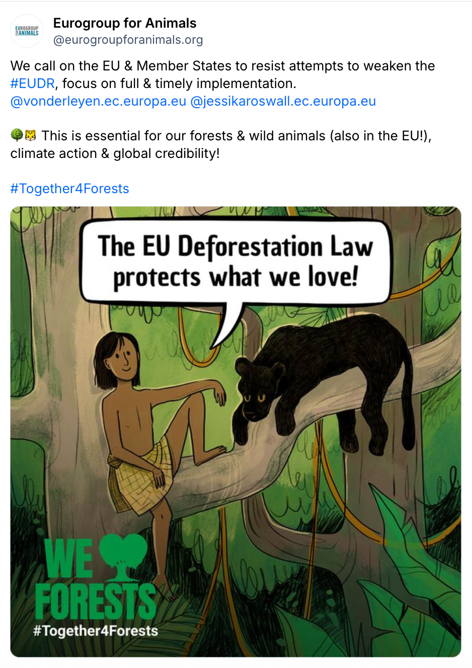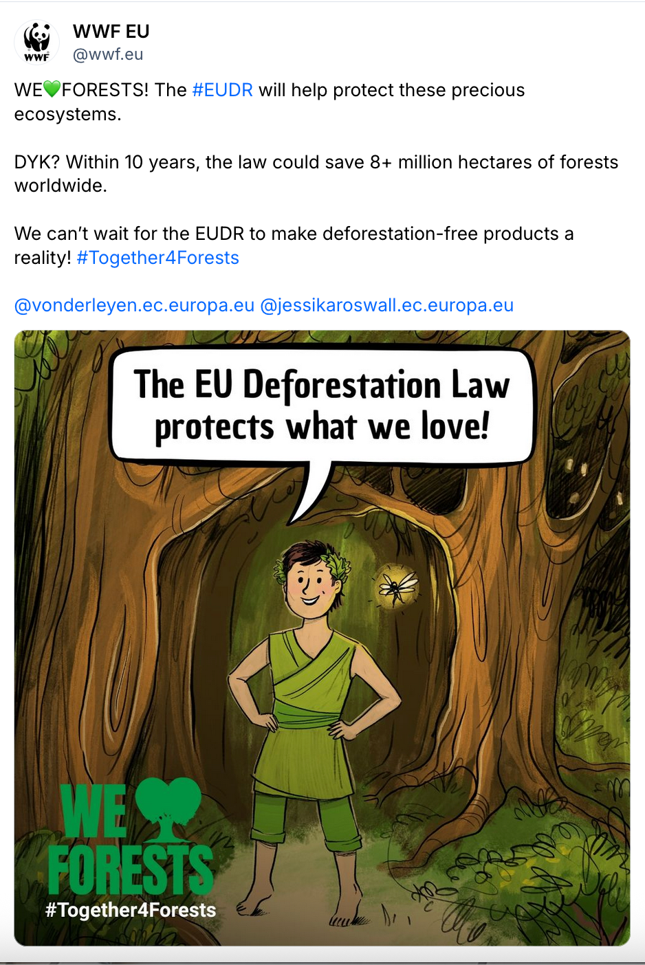 In 2025 they continued to push for this historic law to be enforced, which included this social media campaign featuring illustrations of beloved children's book characters whose stories take place in forested settings, accompanied by the tagline "The EU Deforestation Law protects what we love!"